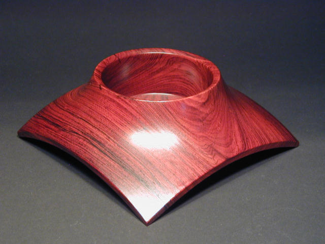 | This piece has a unique twist on bowl design. Made from a solid piece of Cocobolo, gives the illusion of a bowl pushed through a thin square piece of wood. Finished in fine lacquer and carnauba wax. | ||||