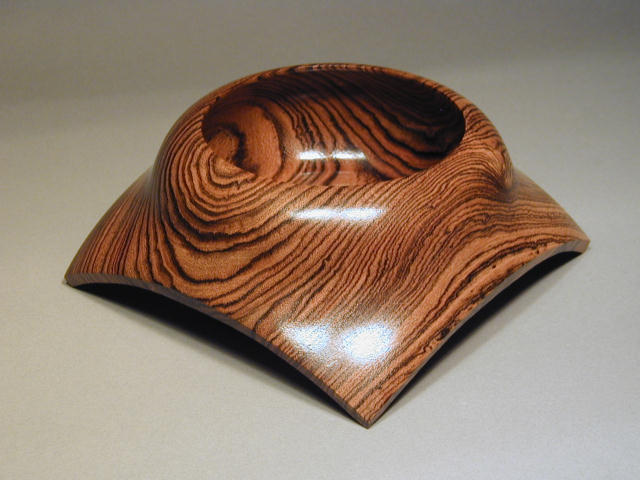 | This piece has a unique twist on bowl design. Made from a solid piece of Bocote, gives the illusion of a bowl pushed through a thin square piece of wood. Finished in polyurethane and carnauba wax. | ||||