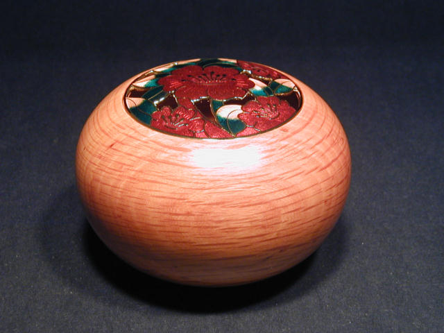 | Removable hand crafted powdered glass Flower Cloisonne lid is fused to highly polished brass trim that reflects like gold. Please note that because lids are hand crafted, they are not perfect in fit. | ||||