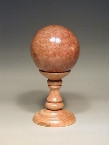 | The three and one quarter inch Brown Mallee burl globe is removable from its Canary wood pedestal. Globe features marble like patterns. Both woods are finished in durable polyurethane. | ||||