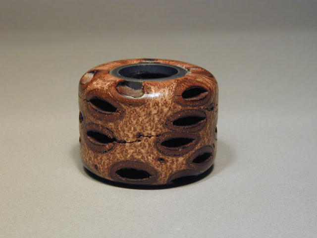 | Paper Clip Holder - An odd and unique usage of nuts from the Australian Banksia Tree. Features magnetic ring to keep paper clips in place. Finished in polyurethane. | ||||