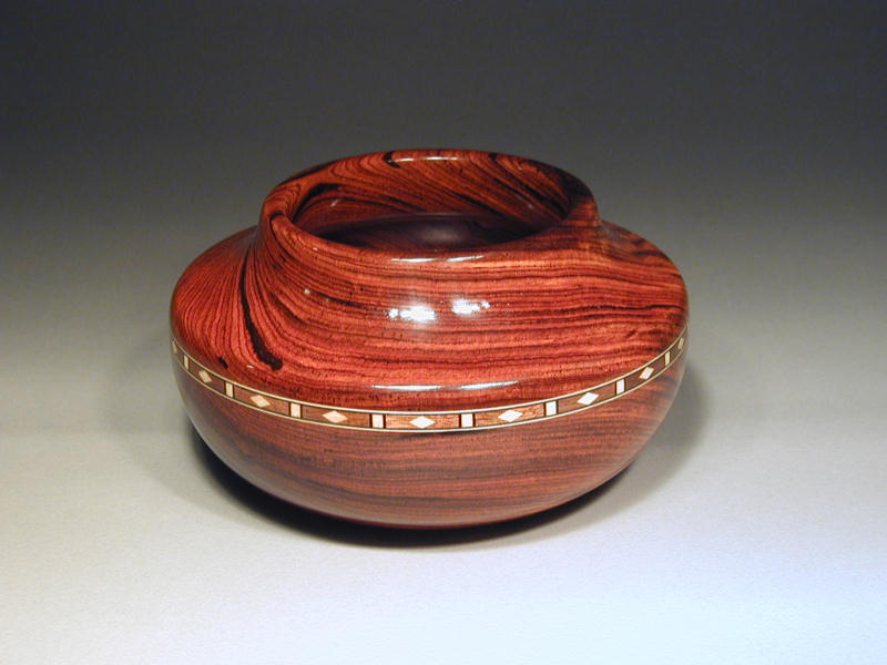 American Indian design shape. Deep reddish brown grain with Walnut, Birch & Ebony inlay band. Finished in Lacquer. |
